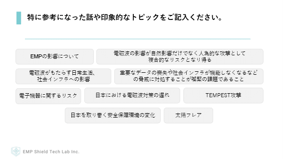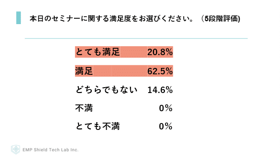 2.「本日のセミナーに関する満足度をお選びください」に対して、「とても満足」20.8%「満足」62.5%、「どちらでもない」14.6%と回答しました。今回の講演では、5つのテーマを軸に、電磁波リスクの技術的実態と制度上の課題、さらに企業や自治体に求められる具体的な対策を解説しました。また、米国のEMP対策規格(MIL-STD-188-125)や連邦政府の取り組みと比較することで、日本国内の制度整備や企業の法的責任への備えにおける方向性も提示。
