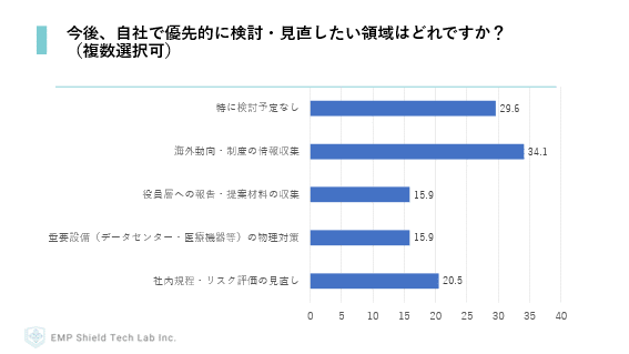 4.「今後、自社で優先的に検討・見直したい領域はどれですか?」に対して、最多は「海外同行・制度の情報収集」34.1%でした。続けて「社内規程・リスク評価の見直し」20.5%、「役員層への報告・提案材料の収集」15.9%、「重要設備(データセンター・医療機器等)の物理的対策」15.9%、「特に検討予定なし」は29.6%となりました。